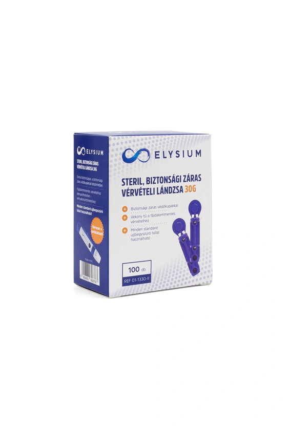 Steril vérvételi lándzsa az Elysiumtól. A biztonsági záras védőkupaknak köszönhetően használata rendkívül biztonságos. Vékony tűje gondoskodik a gyors és fájdalommentes vérvételről. A csomag 100 db vérvételi lándzsát tartalmaz, mely minden standard ujjbegyszúró tollal kompatibilis.